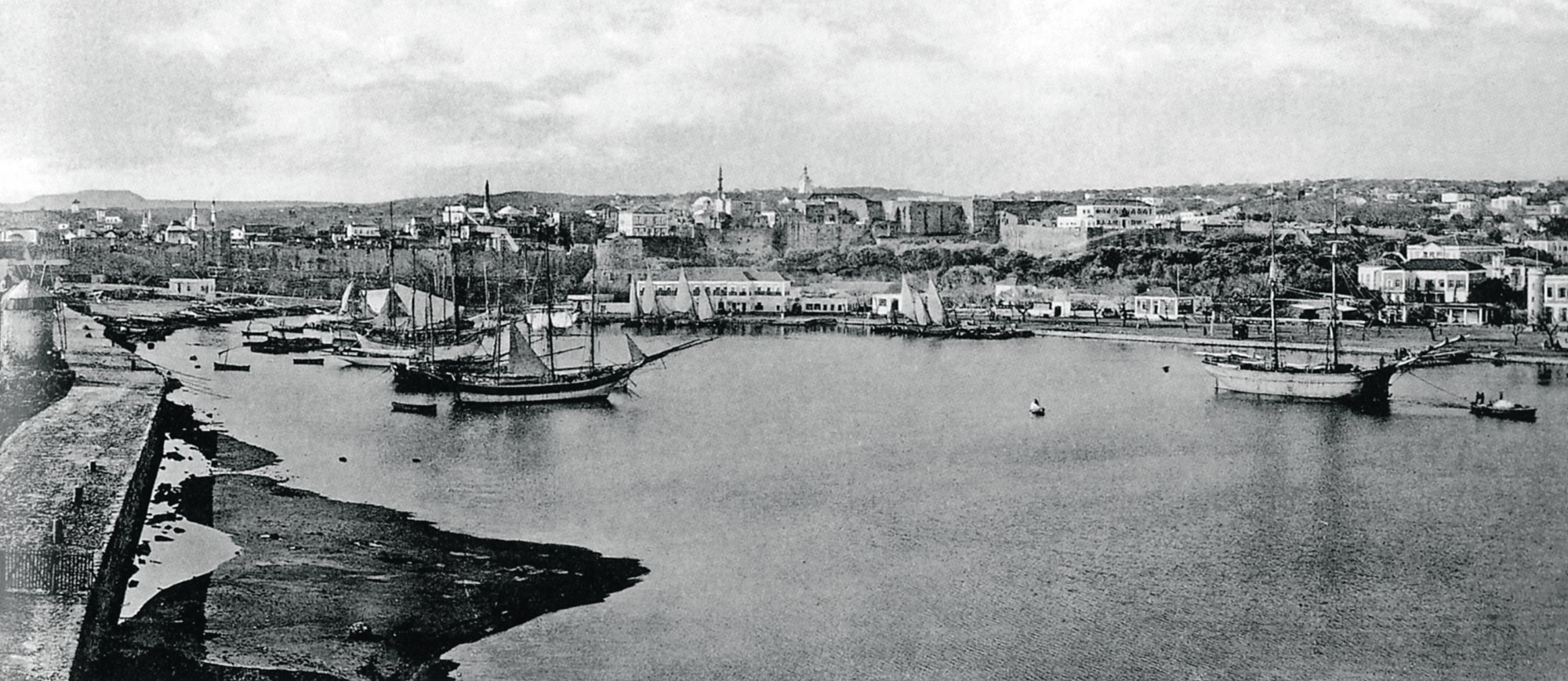 Άποψη από βόρεια (από το φρούριο του Αγίου Νικολάου) της ιστορικής πόλης της Ρόδου και του λιμανιού του Μανδρακίου (1913).