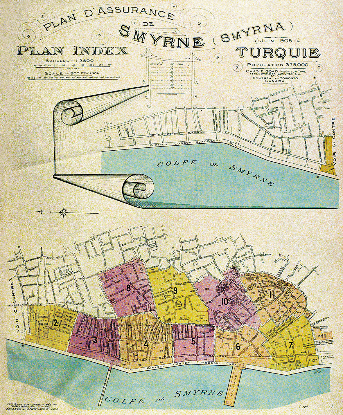 Το θαλάσσιο μέτωπο της Σμύρνης. Γενικό σχέδιο της αποτύπωσης του Τσαρλς Γκόουντ για χρήση ασφαλιστικών εταιρειών (1905). Το 38% του συνόλου των κατόχων των οικοπέδων ήταν Έλληνες.