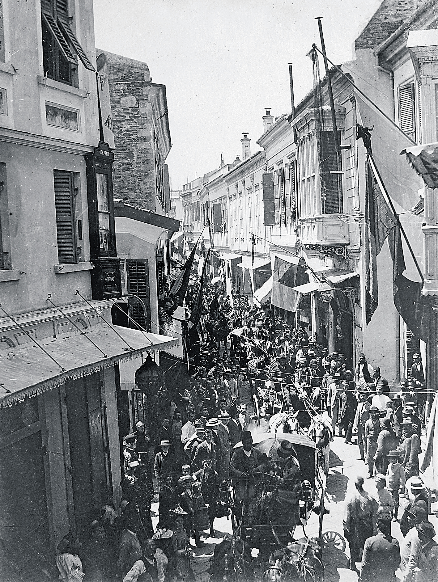 Στις εικόνες από τον φωτογραφικό φακό της εποχής, στις καρτ ποστάλ και στα χαρακτικά, δίνει κίνηση και ήχο η περιγραφή του Μανώλη Αξιώτη, του αφηγητή της Διδώς Σωτηρίου στα Ματωμένα χώματα, όταν πρωτοαντικρίζει το Και τον Σεπτέμβριο του 1910: «…δεν ήξερα τι να πρωτοδώ και τι να πρωτοχαρώ. Τη θάλασσα; Τα βαποράκια της Χαμιδιέ που σκίζανε το νερό δίχως να βουλιάζουν; Τα μεγάλα μαρμαρένια σπίτια με τα ξύλινα κλειστά, όλο μυστήριο, μπαλκόνια τους; Τις καρότσες με το ρυθμικό χτύπο τους πάνω στο γρανιτένιο πλακόστρωτο; Τα τράμια που τα σέρνανε άλογα; Ή όλον εκείνο το χαρωπό, ξέγνοιαστο κόσμο που μπαινόβγαινε με σαματά στις λέσχες και στα καφενεία κι έμοιαζε να ζει πανηγύρι, και όχι μια κοινή καθημερινή μέρα δουλειάς!».