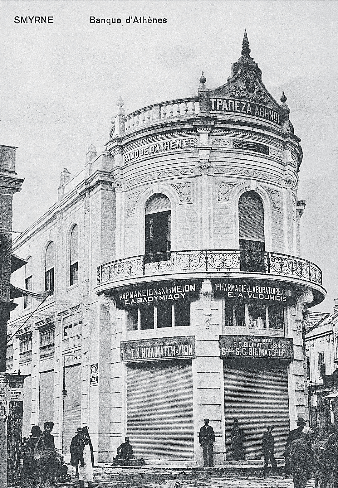 Δίπλα στα κτίρια εμπορικών χρήσεων, πολυτελή ξενοδοχεία, καφενεία, λέσχες και θέατρα φέρουν συχνά ονόματα ελληνικά: «Απόλλων», «Αθηνά», «Βυζάντιο», «Ωραία Ελλάς»… Λίγο πιο πίσω, στον Φραγκομαχαλά, στην Ευρωπαϊκή οδό, χτυπά η εμπορική καρδιά της πόλης. Πολλά από τα πολυτελή καταστήματά της είναι ελληνικής ιδιοκτησίας, όπως το πολυκατάστημα του Ξενόπουλου – «ήταν για τη Σμύρνη ό,τι ο Χάροντς για το Λονδίνο σήμερα» – και το φωτισμένο με εκατοντάδες λαμπτήρες αεριόφωνος κατάστημα Διογένη, και απασχολούσαν κατά κανόνα Ελληνες. Τα μέλη αυτής της ανερχόμενης ελληνικής αστικής τάξης συναντιούνταν σε καφενεία και ζαχαροπλαστεία, σε θέατρα και λέσχες.