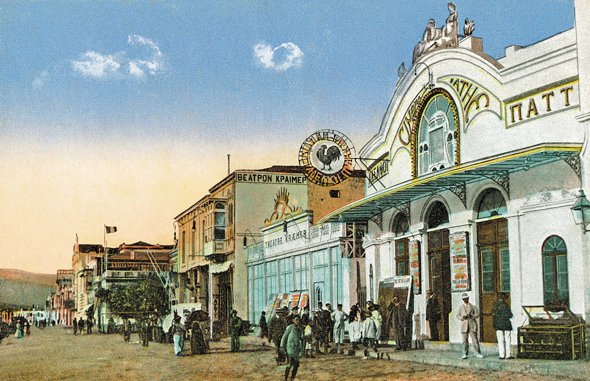 Το κινηματοθέατρο, αποκλειστικός διανομένας των ταινιών της εταιρείας Pathe Freres, σε σχέδια του αρχιτέκτονα Γ. Καλοκαιρινού (1910). Αριστερά, το θερινό θέατρο Κραίμερ.