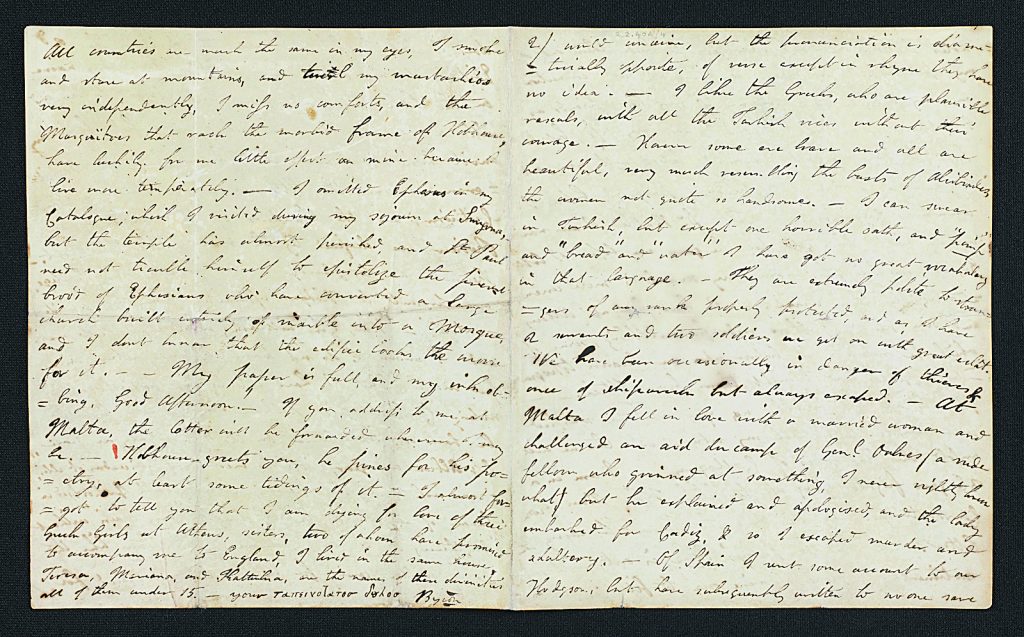 Σελίδα γράμματος του Μπάιρον που λέει, περήφανος, πώς διέσχισε κολυμπώντας τον Ελλήσποντο το 1810