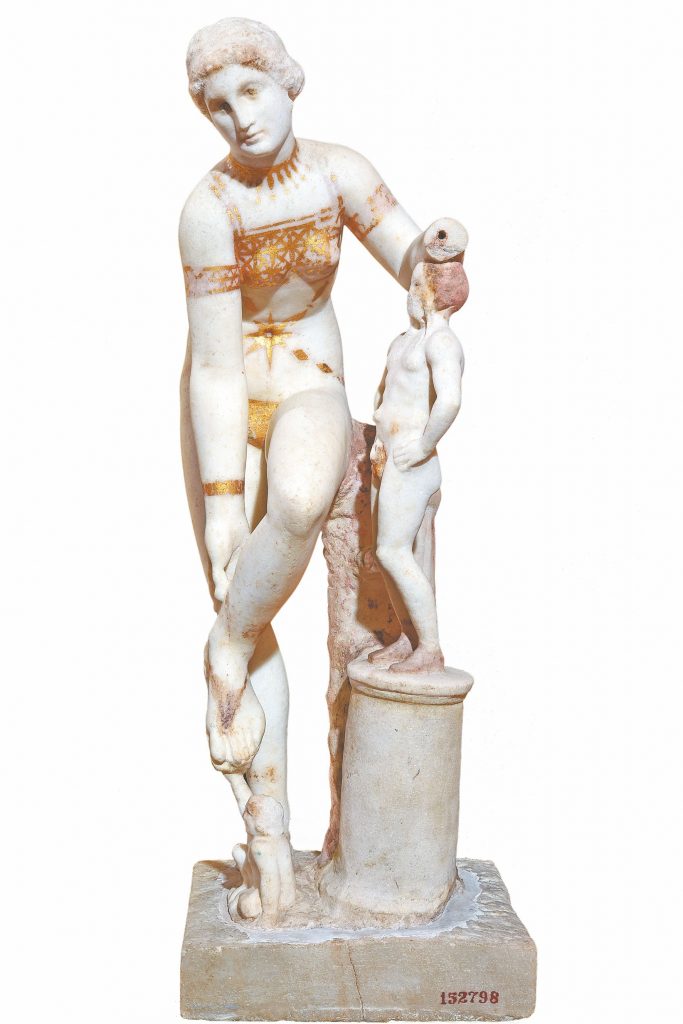 Την ίδια στιγμή οι επισκέπτες του Μουσείου Ακρόπολης μπορούν να θαυμάσουν στο ισόγειό του χωρίς την καταβολή εισιτηρίου, μέχρι και τις 28 Μαΐου, την «Αφροδίτη με το χρυσό μπικίνι», ένα σπάνιο έργο γλυπτικής, το οποίο έφθασε από το Εθνικό Αρχαιολογικό Μουσείο της Νάπολι. Το αγαλμάτιο με ύψος 62,8 εκ. βρέθηκε μαζί με άλλες αρχαιότητες το 1954 στη λεγόμενη έκτοτε «Οικία της Αφροδίτης» στην Πομπηία και χρονολογείται μεταξύ του 1ου αιώνα π.Χ. και του 1ου αιώνα μ.Χ. Η «Αφροδίτη με το χρυσό μπικίνι» εγκαινιάζει τη σειρά εκθέσεων «Περιοδικοί και απρόσμενοι επισκέπτες» που ξεκίνησε στο Μουσείο Ακρόπολης. Ετσι σπουδαία έργα από μουσεία του κόσμου θα έρχονται στους χώρους του, είτε συνδεόμενα με κάποια εορταστική εκδήλωση είτε απρόσμενα, εμπλουτίζοντας την εμπειρία επίσκεψής του.