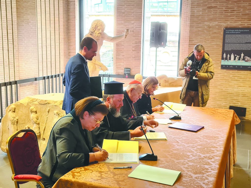 Η υπουργός Πολιτισμού Λίνα Μενδώνη, ο εκπρόσωπος του Αρχιεπισκόπου Αθηνών και πάσης Ελλάδος Ιερώνυμου Β’, πρωτοπρεσβύτερος Εμμανουήλ Παπαμικρούλης, ο πρόεδρος του Κυβερνείου του Κράτους της Πόλης του Βατικανού, καρδινάλιος Φερνάντο Αλτσάγκα, και η διευθύντρια Μουσείων και Πολιτιστικής Κληρονομιάς του Βατικανού, Μπάρμπαρα Ιάτα, υπογράφουν την πράξη δωρεάς.