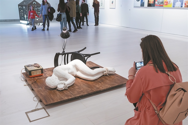Σάββατο μεσημέρι στο ΕΜΣΤ. Δεν επικρατεί ακριβώς το αδιαχώρητο όμως ο κόσμος είναι παντού, το μουσείο είναι επιτέλους ζωντανό και η ατμόσφαιρα θυμίζει ελαφρώς το κλίμα από τις (πρώτες) μέρες της documenta 14. Ούτε η επέλαση του κορωνοϊού δεν έμοιαζε να πτοεί το νεαρότατο, στη συντριπτική του πλειονότητα, κοινό το οποίο ανέβαινε και κατέβαινε σκάλες, φωτογράφιζε έργα και εγκαταστάσεις, περίμενε υπομονετικά τη σειρά του για να φορέσει τα νάιλον προστατευτικά καλτσάκια και να περπατήσει πάνω στους αντικατοπτρισμούς του έργου «Εβραϊκή αγκαλιά» του Λουκά Σαμαρά, να ανέβει στο «Καράβι της ζωής» του Ιλια Καμπακόφ ή απλώς να δρασκελίσει το ηχοτοπίο «Υποπτη συσκευή» του Μάκη Φάρου με την εγκατάσταση των μαύρων ακουστικών να αιωρείται πάνω από το κεφάλι του. Ας μιλήσουν και οι αριθμοί όπως καταγράφονται από τα δελτίου εισόδου: Από τις 28/2 που άνοιξε για το κοινό μέχρι και τις 10/3, από το μουσείο είχαν περάσει γύρω στους 10.000 επισκέπτες (την Κυριακή 8/3 ο αριθμός έφτασε τους 3.200). Οσο μοναχική και αν είναι η σχέση που χτίζουμε με ένα έργο τέχνης και όσα επίπεδα και αν ανακαλύπτεις όταν βρίσκεσαι μόνη και απερίσπαστη σε έναν ήσυχο εκθεσιακό χώρο, η παρουσία του κόσμου που ζωντανεύει το μουσείο δημιουργεί μια διαφορετική, έως και συγκινητική εμπειρία θέασης.
