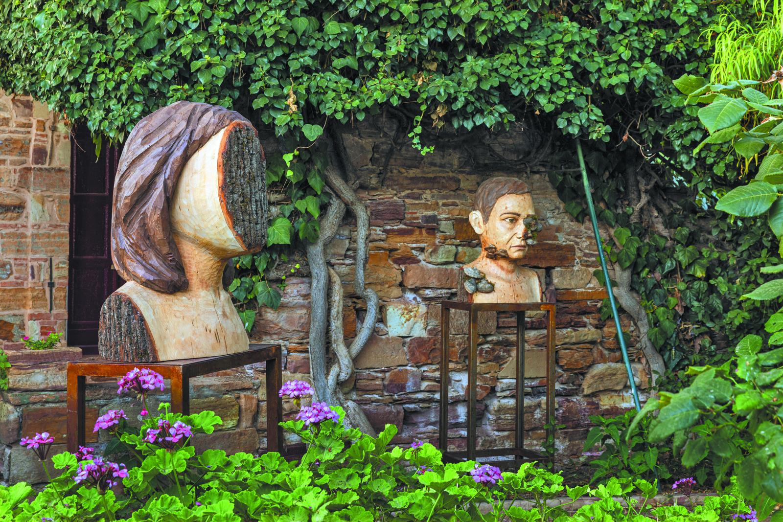 Οι ξυλόγλυπτες προτομές της Γιασάμ Σασμαζέρ («Κάποτε ήμασταν») αποτίνουν φόρο τιμής στους ανθρώπους που πέρασαν από το Κτήμα Καράβα. Φωτογραφία: Νίκος Αλεξόπουλος