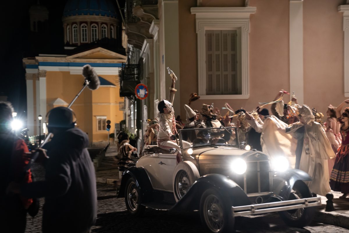 Δεν είναι όμως τυχαίοι επισκέπτες, αλλά οι ήρωες της «Μεγάλης Χίμαιρας» του Μ. Καραγάτση, που ενσαρκώνουν τηλεοπτικά ο Ανδρέας Κωνσταντίνου και η Φωτεινή Πελούζο. Λίγο πιο πέρα τους παρακολουθεί και ο αδερφός του Γιάννη, ο Μηνάς (Δημήτρης Κίτσος). Το συνεργείο δουλεύει με απόλυτη ακρίβεια, σαν καλοκουρδισμένη ορχήστρα που ξέρει πως έχει μόνο λίγα λεπτά για να «πιάσει» το φως. Κανένας δεν μιλάει, κι ας ακολουθούμε αρκετοί δημοσιογράφοι. Και τότε, μέσα στη σιωπή, ακούγεται καθαρά η φωνή του σκηνοθέτη Βαρδή Μαρινάκη: «It’s a wrap!». Το τελευταίο γύρισμα ολοκληρώθηκε και οι συντελεστές ξεσπούν σε χειροκροτήματα.