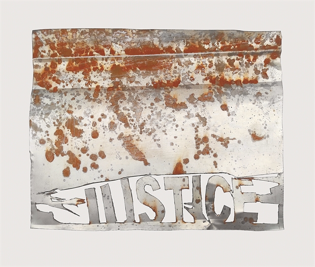 «Ναι, εκεί, σε μια “κοινωνία που δεν έχει σταματήσει να βάλλεται”. Oμως από πού, από τι, με ποιον τρόπο και σε ποια κατεύθυνση; Η κοινωνία παραμένει άραγε άπραγη και απαθής; Αν όχι, ποιες οι αντιστάσεις της; Νομίζω ότι παρά τις διαφορετικές κάθε φορά αφορμές και αιτίες μιας διαμάχης στη σφαίρα του πολιτικού, οι συλλογικές διεκδικήσεις έχουν κοινούς παρονομαστές, διατηρούν έναν διαρκή πυρήνα. Κι αυτός εντοπίζεται, ή θέλω να εντοπίζεται, στο γενικότερο αίτημα για εμβάθυνση της δημοκρατίας και της δικαιοσύνης, μεταξύ άλλων. Αίτημα με το οποίο συντάσσομαι και προσπαθώ να το εμφανίσω ή να το σχολιάσω με πλαστικό πάντοτε τρόπο σε κάποια από τα έργα της τελευταίας έκθεσης. Επέλεξα να χαράξω τις λέξεις “δημοκρατία” και “δικαιοσύνη” σε σκληρά μα φθηνά και ταπεινά υλικά, τα οποία υπόκεινται στη φθορά, στην οξείδωση και, ταυτόχρονα, αντιστέκονται σε αυτήν. Ισως αποφεύγω μια ξεκάθαρη απάντηση. Να πω μόνο ότι όπως ακριβώς υπάρχει κάτι σταθερό στα κοινωνικά αιτήματα που παίρνει μια συγκυριακά καινούργια μορφή, έτσι θα έλεγα συμβαίνει και με τα έργα. Οι μετακινήσεις στη θεματική ή στα υλικά υφίστανται αλλά δεν είναι αρκετές ώστε να συγκροτούν μια τόσο ξεχωριστή ενότητα σε σχέση με το παρελθόν».