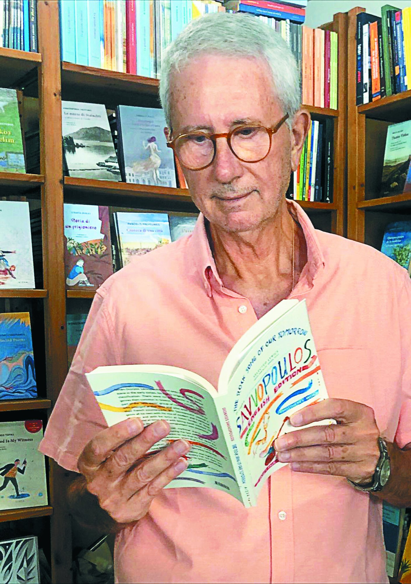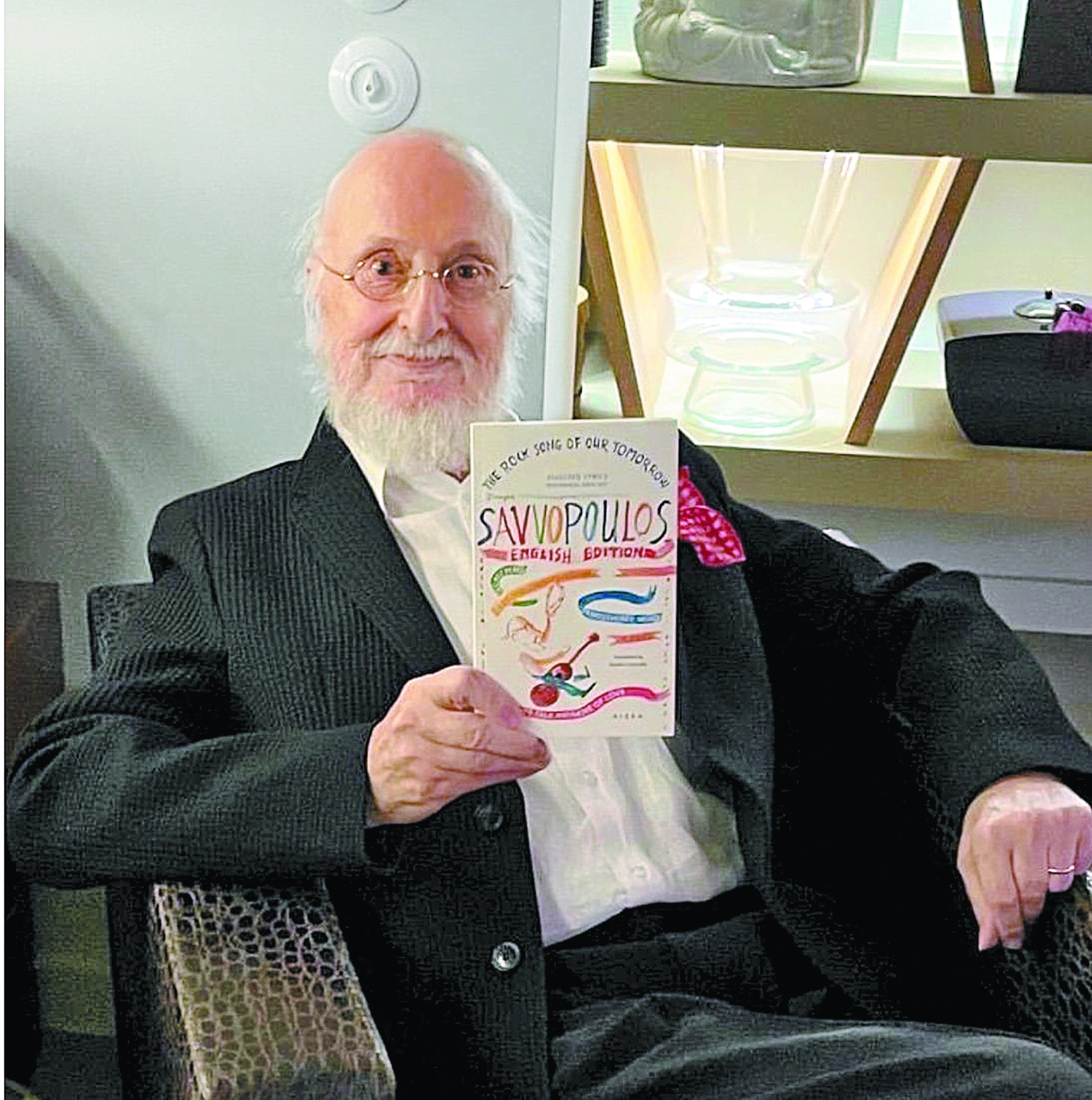 Ο Διονύσης Σαββόπουλος κρατά χαμογελαστός το βιβλίο.