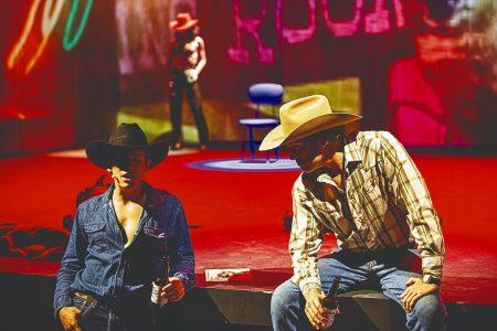 Κατόπιν, σχετικά πρόσφατα, ο Ασλεϊ Ρόμπινσον το διασκεύασε (με εμπνευσμένο μέτρο) για το θέατρο (2023). Η παράσταση που σκηνοθετεί ο Κωνσταντίνος Ρήγος είναι (αναπόφευκτα ίσως) προσαρμοσμένη στην κινηματογραφική μυθολογία του «Brokeback Mountain», χρησιμοποιεί ένα δεδομένο απόθεμα όψης και αισθητικής (με μεγάλες οθόνες προβολής, σε μια προσεγμένη παραγωγή με αρκετή ζωντανή μουσική). Ορισμένες πλευρές της κινησιολογίας (και της όποιας καθοδήγησης των ερμηνευτών) δεν θα μπορούσαν να ανήκουν, προφανώς, στο ρεπερτόριο δύο γελαδάρηδων, αλλά πρόκειται για πταίσματα που δεν αλλάζουν τη συνολική εικόνα. Εν πάση περιπτώσει, υπάρχει ένα στυλιζάρισμα που ναι μεν δεν εξαντλεί την πολυεπίπεδη τραχύτητα αυτής της ιστορίας, πλην όμως δεν την προδίδει κιόλας (έχει σεβασμό και αυτοσυγκράτηση ο Ρήγος). Το στυλιζάρισμα ανταποκρίνεται μάλλον και στον ορίζοντα πολλών επίδοξων, σημερινών θεατών (που περιμένουν ίσως κάποιο mainstream ομοφυλοφιλικό δράμα με σπιρούνια και το προβλεπόμενο γυμνό). Μην παρεξηγηθούμε ωστόσο, μιλάμε για μια δουλειά αξιοπρόσεκτη. Είναι αρκετές οι στιγμές που ο πόθος, η απελπισία και η τρυφερότητα βρίσκουν τη θερμοκρασία τους.