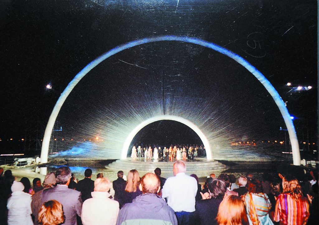 Σκηνή από την παράσταση «Τρωάδες» με πρωταγωνίστρια την Ειρήνη Παπά, σε σκηνικά του Σαντιάγκο Καλατράβα στο περιστρεφόμενο Θέατρο Ρώμης, το οποίο σχεδίασε ο Μάνος Περράκης το 2002.