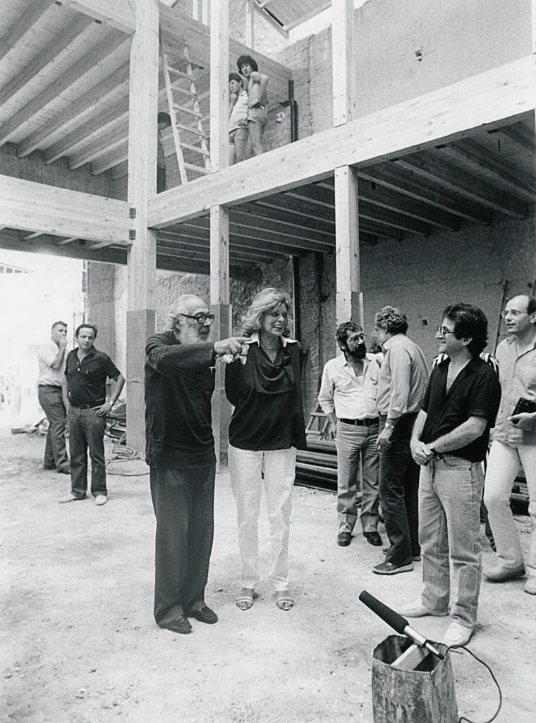 Kάρολος Kουν, Μελίνα Μερκούρη και Μάνος Περράκης συζητούν κατά την κατασκευή του Θεάτρου Τέχνης της οδού Φρυνίχου.