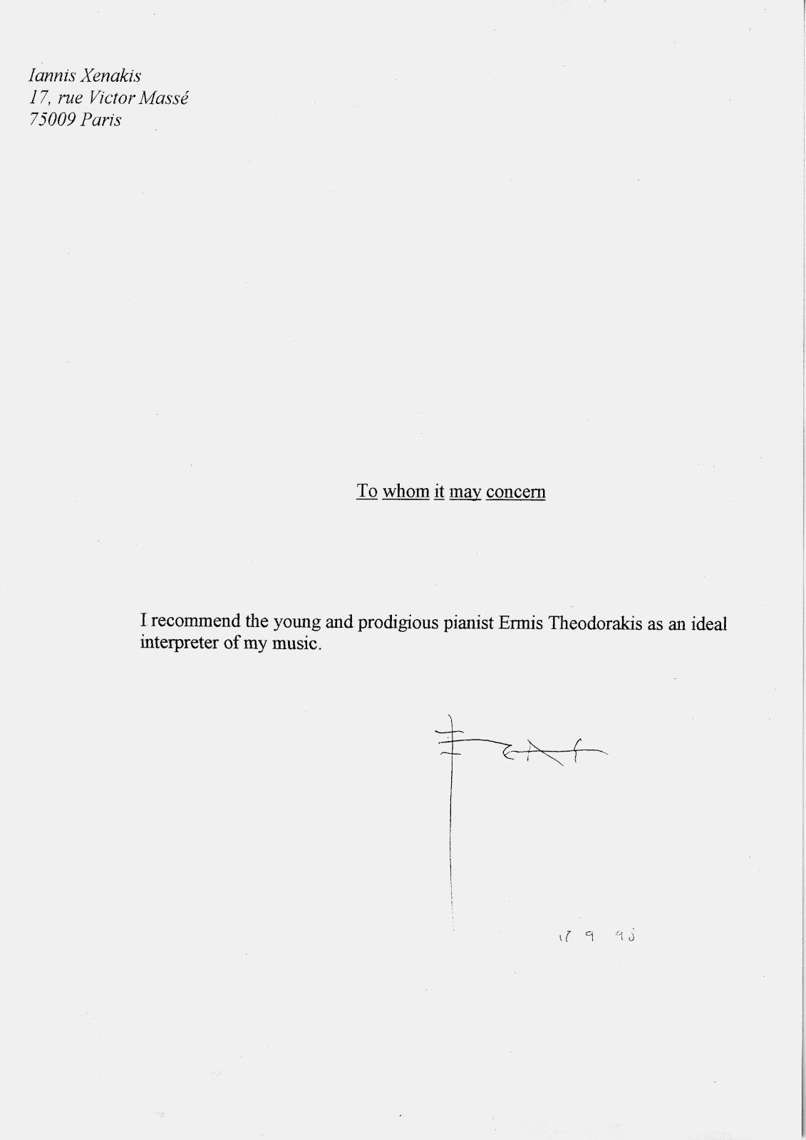 «Την επομένη φάγαμε μαζί σε εστιατόριο στο κέντρο της Θεσσαλονίκης» θυμάται ο Θεοδωράκης. «Ηταν με τη σύζυγό του Φρανσουάζ, τον μάνατζέρ του, ο Ιωαννίδης και εγώ. Μιλούσε καλά ελληνικά. Αναφέρθηκε σε διάφορα θέματα και απευθυνόμενος σε εμένα είπε ότι βεβαίως δεν είναι εξωστρεφής άνθρωπος και μετά από μια συναυλία κρατά τις καλές ή κακές σκέψεις για τον εαυτό του, αλλά στη δική μου περίπτωση ήταν μόνο καλές. Μετά από κάποιους μήνες παίρνω ένα γράμμα με συστατική επιστολή του Ξενάκη, που γράφει στα αγγλικά ότι με θεωρεί έναν ιδανικό ερμηνευτή των έργων του».