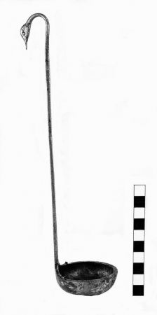 Χάλκινη κουτάλα με κεφάλι πάπιας ή αρύταινα, όμοια στις λεπτομέρειες με το παράδειγμα που βρέθηκε στο Δερβένι βόρεια της Θεσσαλονίκης, περί το 320 π.Χ