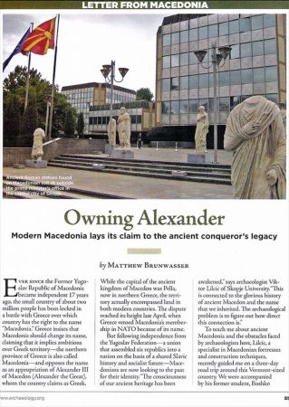 Η πρώτη σελίδα του άρθρου στο Αρχαιολογία, Ιανουάριος/Φεβρουάριος 2009. Γεμάτο με ιστορικές ανακρίβειες, αλλά με σημειωμένη τη δήλωση της Ελλάδας που επιμένει ότι το όνομα Μακεδονία ενέχει αλυτρωτικές βλέψεις στην Ελληνική επικράτεια