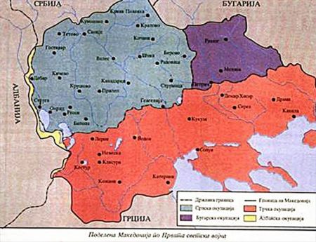 Χάρτης της “Μακεδονίας” που δείχνει εδάφη που καταλαμβάνονται από την Αλβανία (κίτρινο), τη Βουλγαρία (μωβ) και την Ελλάδα (κόκκινο). Από το βιβλίο ιστορίας της 2ας Γυμνασίου που εκδόθηκε το 2005