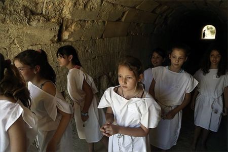 Νεαροί συμμετέχοντες εισέρχονται στο στάδιο μέσω της αρχαίας σήραγγας στην αναβίωση των Νέμεων Αγώνων του 2016