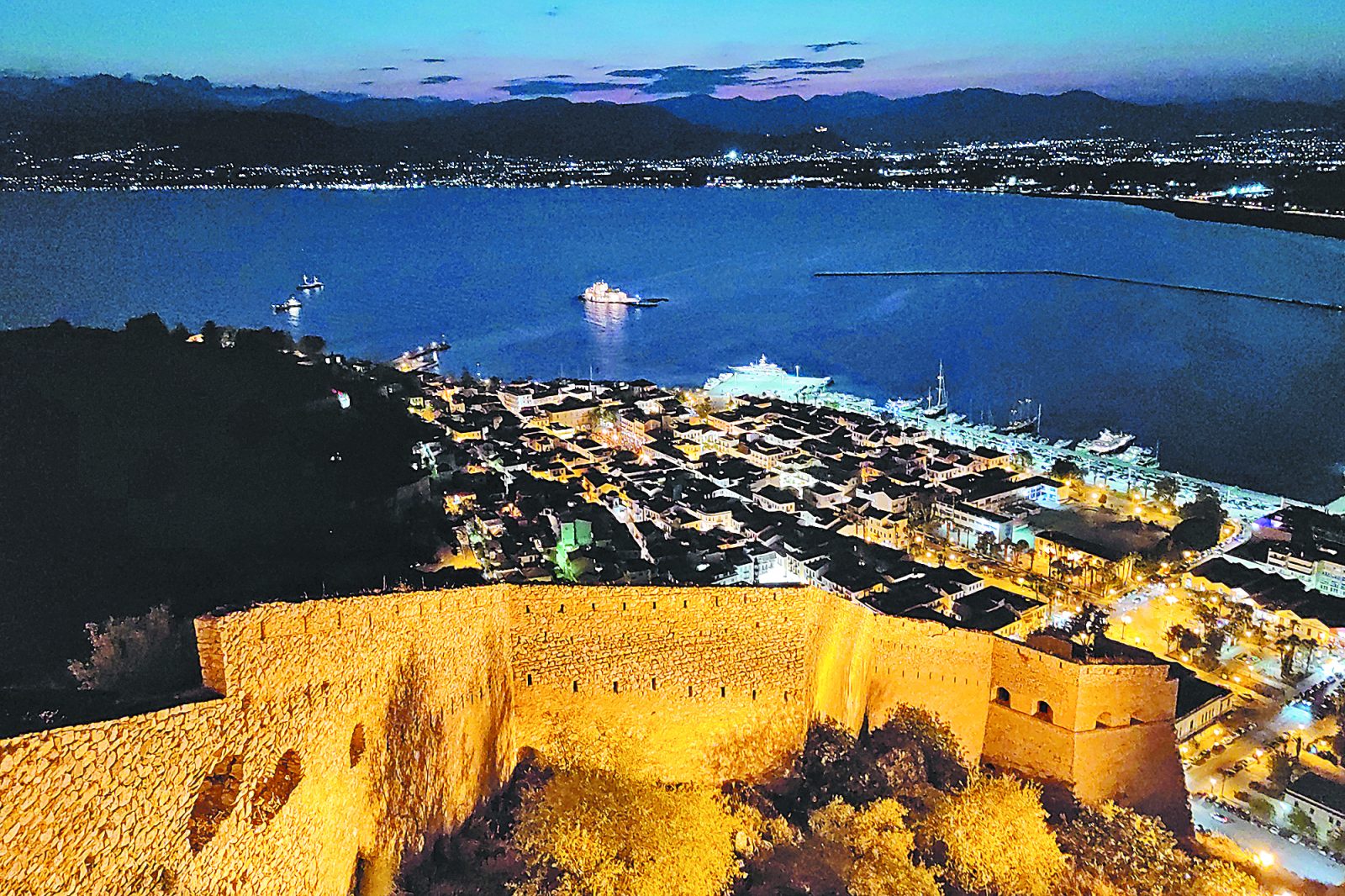 Νυχτερινή φωτογραφία του Ναυπλίου, στην κορυφή του οποίου δεσπόζει το Κάστρο του Παλαμηδίου