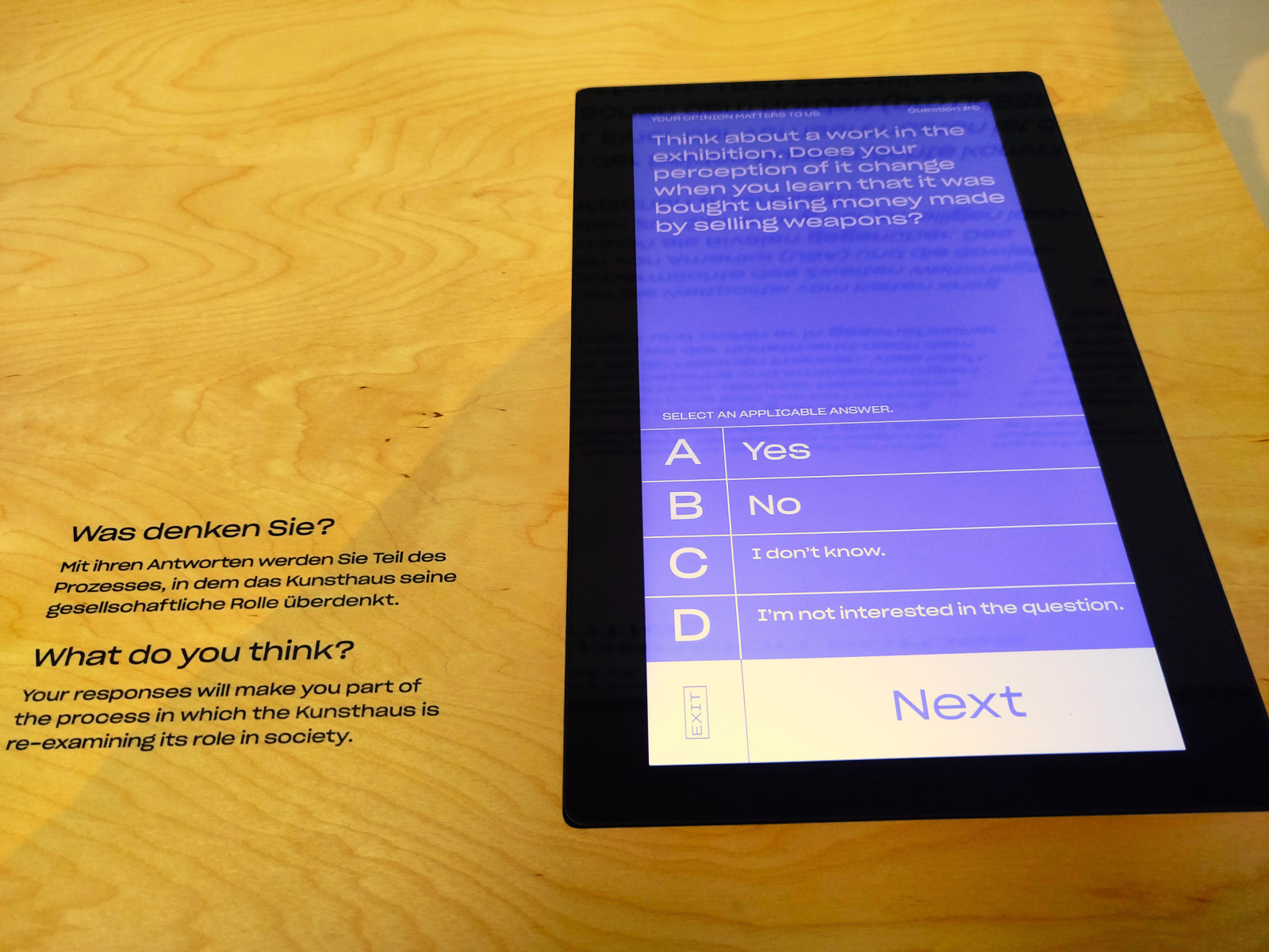 «Σκέψου για ένα έργο της έκθεσης. Η αντίληψή σου γι’ αυτό αλλάζει όταν μαθαίνεις ότι αγοράστηκε με χρήματα που προέρχονται από την πώληση όπλων;». Οι έως τώρα απαντήσεις των επισκεπτών είναι 48% ναι, 47% όχι