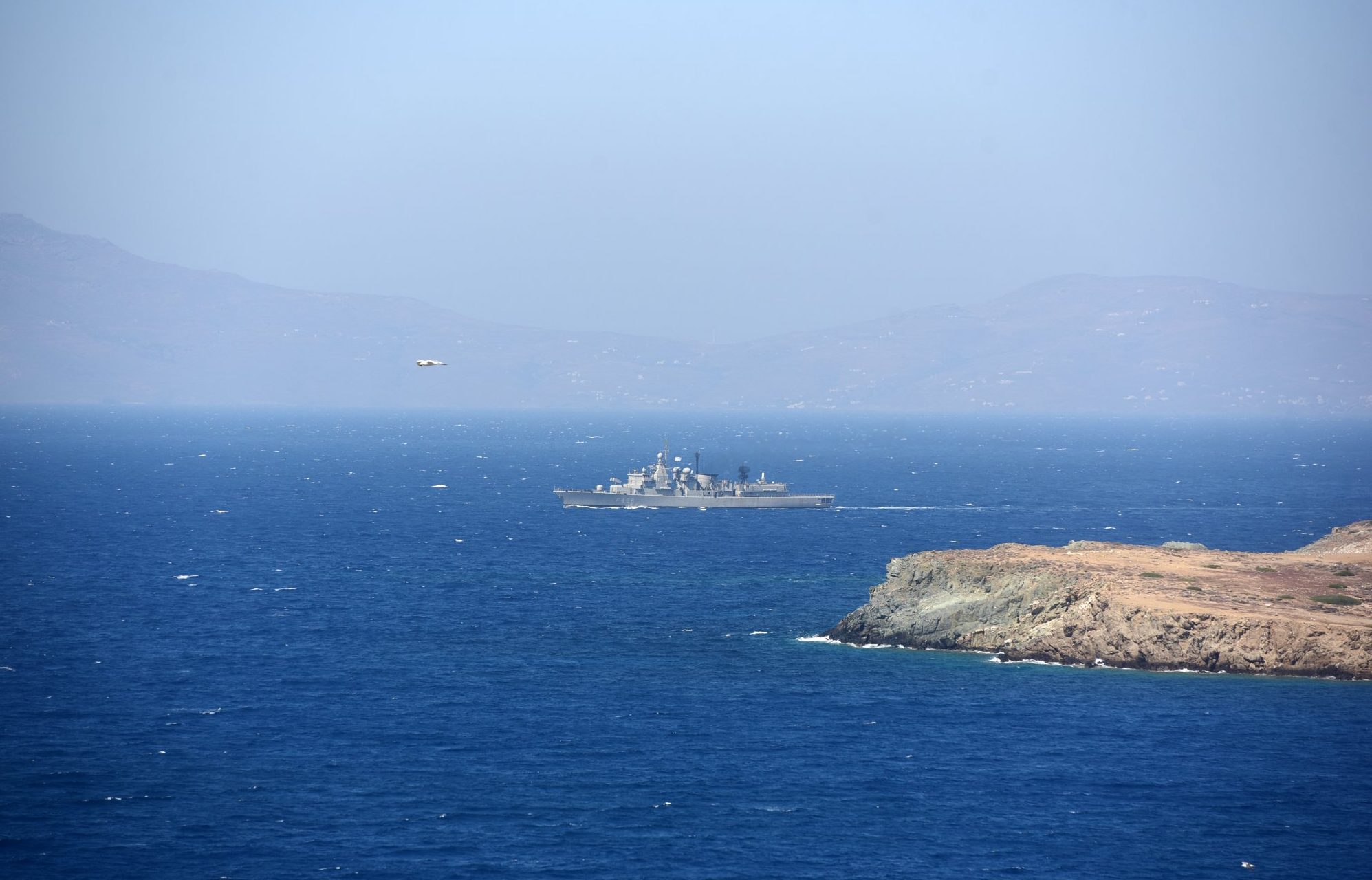 Υπήρξε προς στιγμήν ένταση ανοικτά της Κάσου, με την αιφνιδιαστική εμφάνιση τουρκικών πολεμικών πλοίων ανοικτά της νήσου των Δωδεκάνησων. Τα τουρκικά πλοία επέστρεφαν από την κατεχόμενη Κερύνεια μετά τη φιέστα της Αγκυρας με τους πανηγυρισμούς ντροπής για την 50ή επέτειο της τουρκικής εισβολής στην Κύπρο και επιχειρούσαν να εμποδίσουν ιταλικό πλοίο να διεξαγάγει έρευνες εντός της ελληνικής ΑΟΖ. Ελληνικά και τουρκικά πλοία βρέθηκαν πάλι απέναντι θυμίζοντας άλλες εποχές κρίσεως όπως αυτή με το «Oruc Reis», όταν και τότε οι στόλοι των δύο χωρών βγήκαν στο Αιγαίο και βρέθηκαν αντιμέτωποι με κανόνες εμπλοκής.