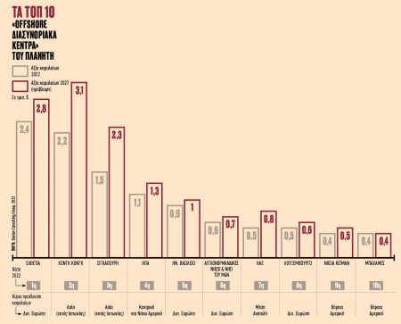 Σύμφωνα με τη μελέτη της Boston Consulting Group (BCG), ο πόλεμος στην Ουκρανία, η αποδυνάμωση της Ευρώπης και η δημιουργία νέου πλούτου στην Ασία και σε χώρες του Ειρηνικού δημιουργούν αναταράξεις στον κόσμο των υπεράκτιων κεφαλαίων. Από τα τοπ 10 offshore διασυνοριακά κέντρα του πλανήτη, 2,4 τρισ. δολάρια είναι τοποθετημένα σήμερα στην Ελβετία, το offshore banking της οποίας προσελκύει κυρίως κεφάλαια από τη Δυτική Ευρώπη, αλλά και από τη Μέση Ανατολή, η οποία ως το 2027 θα χάσει την πρώτη θέση από το Χονγκ Κονγκ (σήμερα είναι τοποθετημένα 2,2, τρισ. δολάρια), το οποίο αναμένεται να προσελκύσει 3,1 τρισ. υπεράκτιο πλούτο έναντι 2,8 τρισ. της Ελβετίας.