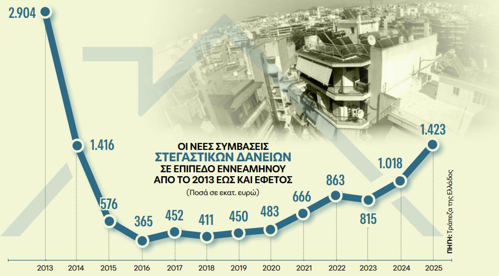 Τραπεζική πηγή εκτιμά ότι το 2025 θα κλείσει με νέα στεγαστικά δάνεια ύψους 2 δισ. ευρώ, εκ των οποίων τα 500 εκατ. ευρώ μέσω του εν εξελίξει επιδοτούμενου από το Δημόσιο προγράμματος.