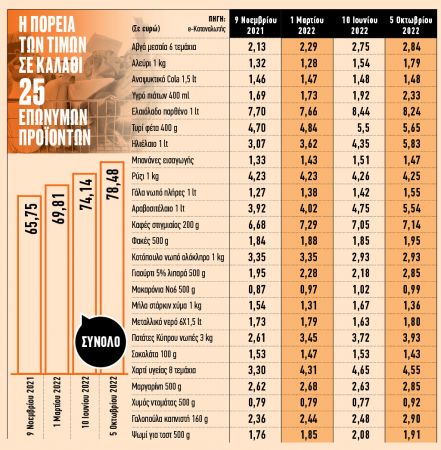 Είναι χαρακτηριστικό ότι στη λίστα των 25 προϊόντων που παρακολουθεί «Το Βήμα» από τον περυσινό Νοέμβριο ο συνολικός λογαριασμός έχει ανέβει κατά 19,3%.