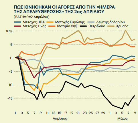 Η ανακωχή των 90 ημερών στον εμπορικό πόλεμο ΗΠΑ – Κίνας επανέφερε τη διάθεση για ανάληψη επενδυτικού κινδύνου οδηγώντας σε άνοδο των μετοχών των κρυπτονομισμάτων, των εμπορευμάτων και του δολαρίου, με τις τιμές του χρυσού και των ομολόγων να σημειώνουν απώλειες, ενώ και το Χρηματιστήριο της Αθήνας σημειώνει άνοδο περίπου 21% από την αρχή του έτους, σημειώνοντας νέα υψηλά 15ετίας, με τις ελληνικές μετοχές να κερδίζουν περίπου 19 δισ. ευρώ το ίδιο διάστημα.