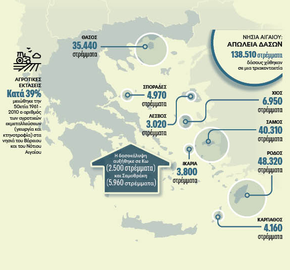 Δασικές εκτάσεις που θα έφθαναν να καλύψουν ένα μεσαίου μεγέθους νησί όπως είναι η Τήνος, η Μήλος ή η Τζια χάθηκαν τα τελευταία τριάντα χρόνια από το Αιγαίο. Συνολικά, από τον χάρτη των αιγαιοπελαγίτικων νησιών, εντός μιας 30ετίας, εξαφανίστηκαν 138.510 στρέμματα δάσους και «φύτρωσαν» 85.000 στρέμματα τσιμέντου, ενώ μέσα σε τέσσερις δεκαετίες εγκαταλείφθηκαν οι 4 στις 10 αγροτικές εκμεταλλεύσεις.