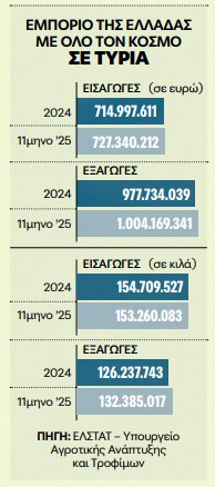 Σύμφωνα με στοιχεία της ΕΛΣΤΑΤ και του ΥΠΑΑΤ, το 2024 οι εξαγωγές τυριών ανήλθαν σε 977,7 εκατ. ευρώ, ξεπερνώντας τις εισαγωγές (715,0 εκατ. ευρώ). Η θετική τάση συνεχίστηκε και στο 11μηνο του 2025, με τις εξαγωγές να υπερβαίνουν το 1 δισ. ευρώ.
