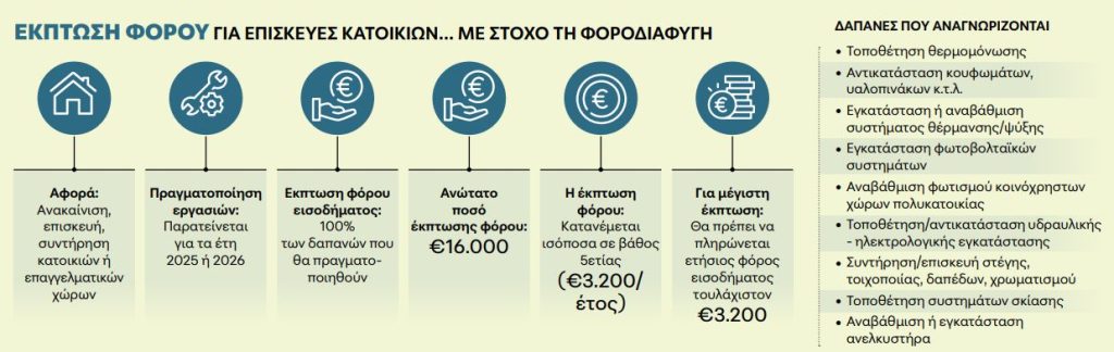 Επίσης, οι δαπάνες για την αγορά αγαθών και τη λήψη υπηρεσιών που σχετίζονται με την ενεργειακή, λειτουργική και αισθητική αναβάθμιση κτιρίων μειώνουν, ισόποσα κατανεμημένες σε περίοδο πέντε ετών, τον φόρο εισοδήματος των φυσικών προσώπων, μέχρι του αναλογούντος φόρου για κάθε φορολογικό έτος. Η έκπτωση από τον φόρο εισοδήματος είναι ίση με το 100% των δαπανών που θα πραγματοποιηθούν εντός του 2025 ή το 2026.