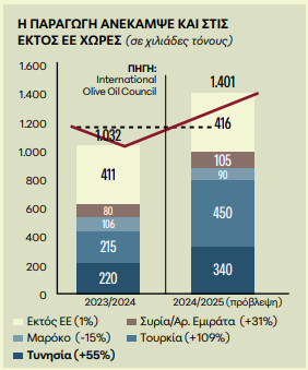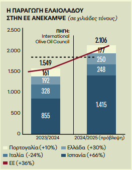 Η σημαντική άνοδος στις χώρες της ΕΕ είναι απόρροια κύρια της αύξησης της παραγωγής στην Ισπανία (+66% στα 1,41 εκατ. τόνους από τις 855 χιλιάδες τόνους), την Ελλάδα (+30% στις 250 χιλιάδες τόνους το 2024-25 από 192 χιλιάδες τόνους το 2023-24) και την Πορτογαλία (+10% στις 177 χιλιάδες τόνους από 161 χιλιάδες τόνους), ενώ η παραγωγή στην Ιταλία εμφανίζει πτώση (-24% στις 248 χιλιάδες τόνους από 328 χιλιάδες τόνους).