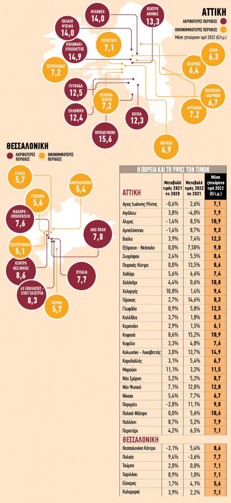 Αυτή τη στιγμή για το φθηνότερο σπίτι στην Αθήνα πρέπει κάποιος να πληρώσει ενοίκιο πάνω από 6 ευρώ ανά τ.μ. μηνιαίως, ενώ στη Θεσσαλονίκη η τιμή είναι ελαφρώς χαμηλότερη, ήτοι 5,7 ευρώ ανά τ.μ. τον μήνα.