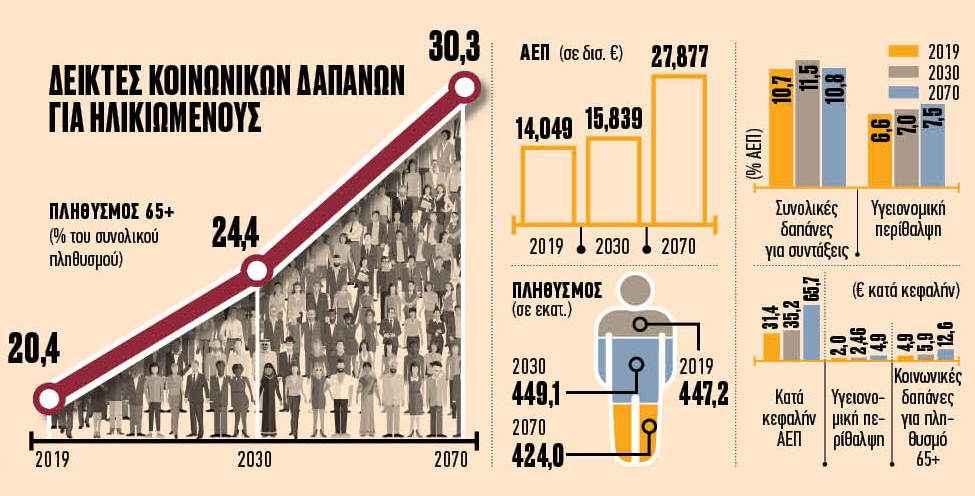 Σύμφωνα με τα στοιχεία που έλαβε υπόψη της η ομάδα των εμπειρογνωμόνων, οι δείκτες κοινωνικών δαπανών για τους ηλικιωμένους δείχνουν μια επιδείνωση έως το 2070 ιδιαιτέρως ως προς το ποσοστό των συντάξεων επιζώντων σε σχέση με το ΑΕΠ.
