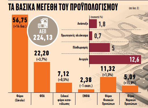 Ενδιαφέροντα είναι τα στοιχεία για τους φόρους εισοδήματος φυσικών και νομικών προσώπων καθώς προβλέπεται να διαμορφωθούν στο ποσό των 17,77 δισ. ευρώ, αυξημένα κατά 916 εκατ. ευρώ ή 5,4% έναντι του 2022.