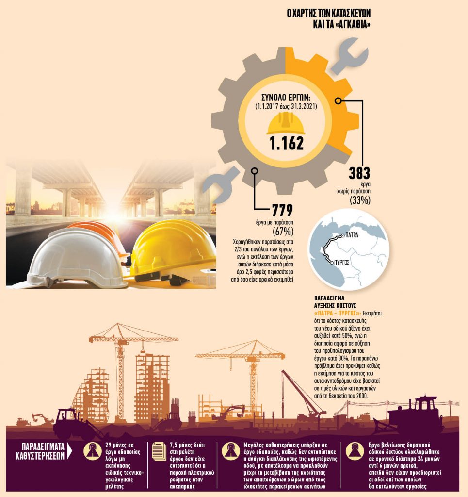 Ωστόσο, τα πράγματα στην Ελλάδα μόνο ρόδινα δεν μπορούν να χαρακτηριστούν σε ό,τι αφορά την πορεία του κατασκευαστικού κλάδου, με τις μεγάλες καθυστερήσεις που καταγράφονται στην εκτέλεση των δημόσιων έργων να συνεπάγονται χαμένα χρήματα, ανατροπή του προγραμματισμού των φορέων και ελλιπή εξυπηρέτηση των αναγκών που προορίζονται να καλύψουν.