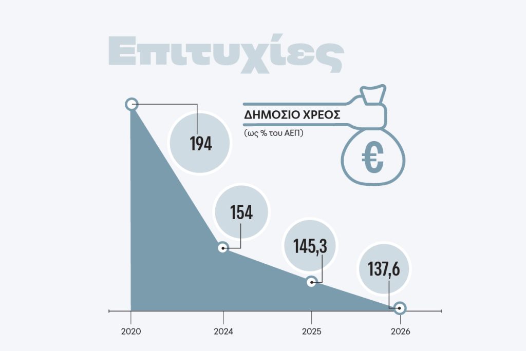 Η Ελλάδα εισήλθε στην τριετία 2024-2026 με θετικούς ρυθμούς ανάπτυξης και αποκατεστημένη δημοσιονομική αξιοπιστία. Το δημόσιο χρέος μειώνεται σταδιακά. Από 194% του ΑΕΠ το 2020 σε 154% το 2024 και εκτιμάται στο 137,6% το 2026.
