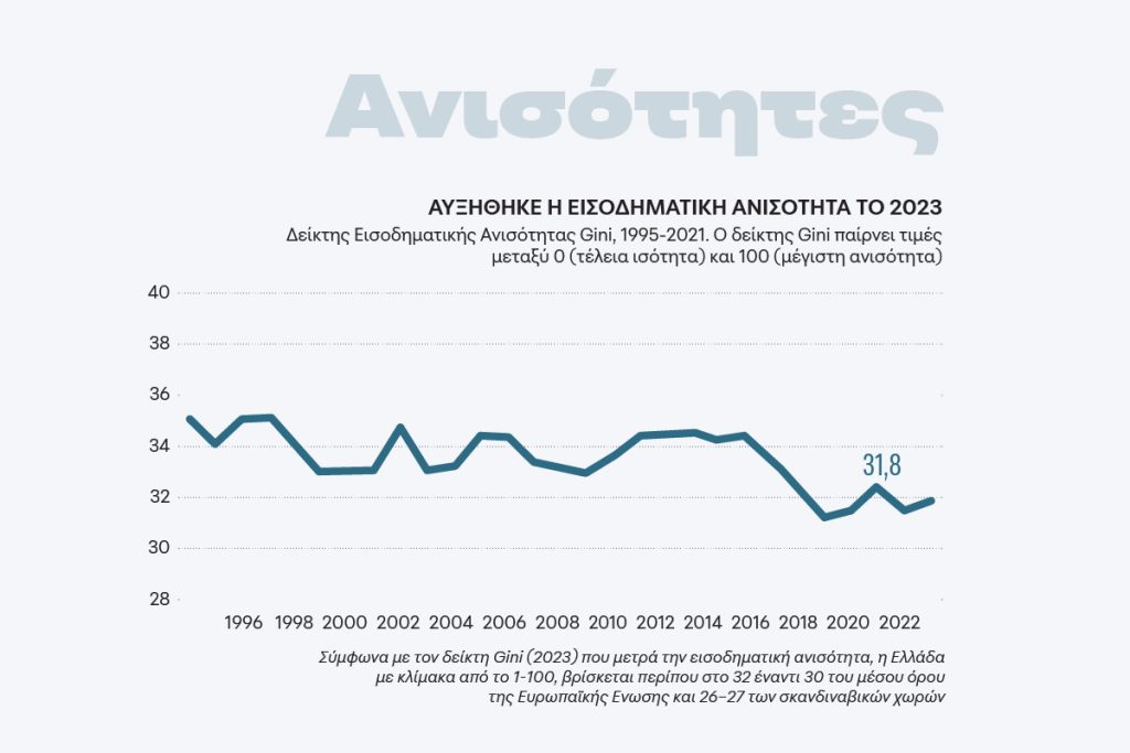 Ο δείκτης Gini, που μετρά την εισοδηματική ανισότητα, βρίσκεται στο 32 (έναντι 30 του ευρωπαϊκού μέσου όρου), ενώ το ποσοστό πολιτών σε κίνδυνο φτώχειας ή κοινωνικού αποκλεισμού αγγίζει το 26,9%, έναντι 21% στην ΕΕ. Αυτά τα στοιχεία αποτυπώνουν μόνιμη στρέβλωση της ανάπτυξης χωρίς δικαιότερη κατανομή.