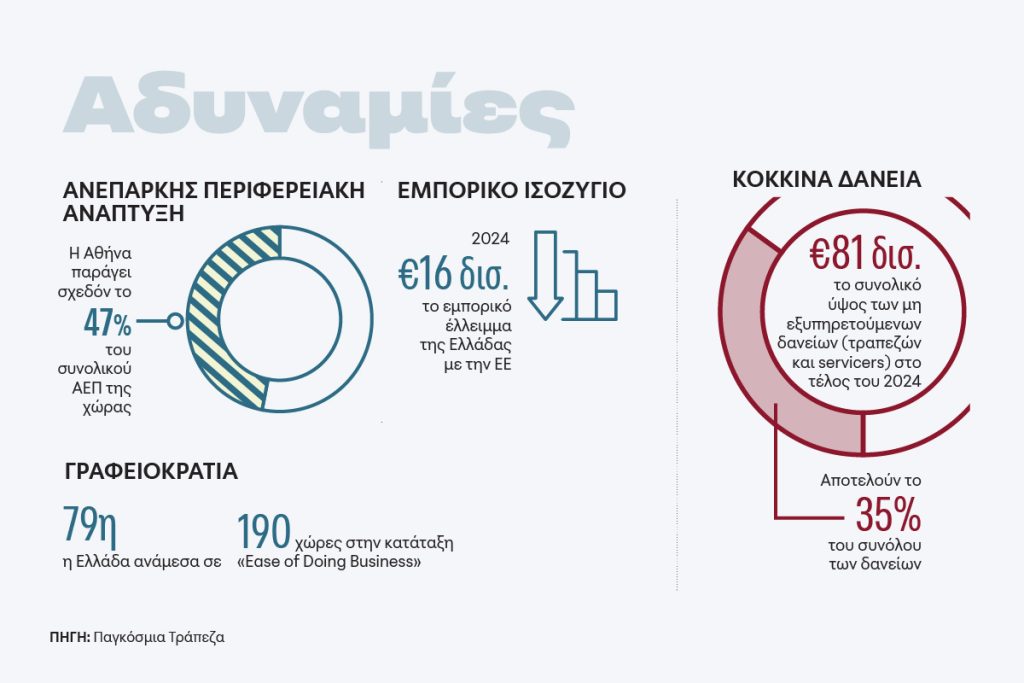 Ο μέσος μισθός του 2024 υπολείπεται κατά 25% του ευρωπαϊκού μέσου όρου, ενώ σε πραγματικούς όρους είναι σχεδόν 30% χαμηλότερος από εκείνον του 2008. Η ανεργία έχει υποχωρήσει στο 8,6%, όμως η αδυναμία αποταμίευσης παραμένει εκτεταμένη. Επτά στους δέκα νέους δηλώνουν ότι δεν μπορούν να αποταμιεύσουν ούτε 100 ευρώ τον μήνα, ενώ το πλουσιότερο 1% των ενηλίκων κατέχει περίπου 375 δισ. ευρώ, δηλαδή το 30% του ιδιωτικού πλούτου της χώρας.