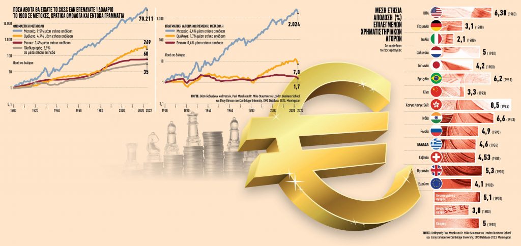 Κοινός τόπος είναι πάντως πως οι μετοχές ιστορικά σε βάθος χρόνου υπεραποδίδουν των εναλλακτικών μορφών επενδύσεων. Σύμφωνα π.χ. με τη βάση δεδομένων των καθηγητών Paul Marsh και Dr Mike Staunton της London Business School και Elroy Dimson του Cambridge University και στοιχείων της Morningstar και ελβετικών τραπεζών, αν κάποιος επένδυε το 1900 ένα δολάριο ΗΠΑ σε μετοχές, στο τέλος του 2022 θα είχε συγκεντρώσει σε ονομαστική αξία 70.210 δολάρια έναντι 269 δολαρίων αν τα είχε τοποθετήσει σε ομόλογα και 60 δολαρίων αν τα επένδυε στα έντοκα γραμμάτια που έχουν περισσότερο και τον ρόλο των μετρητών.