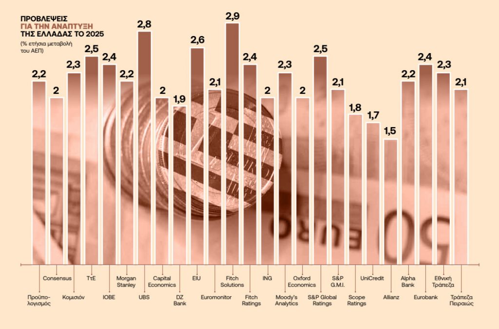 Παράλληλα, ο γεωπολιτικός κίνδυνος, οι πολιτικές Τραμπ για την Ευρώπη και οι δασμοί θα μπορούσαν να ανατρέψουν το οικονομικό σκηνικό στη Γηραιά Ηπειρο, κάτι που δεν μπορεί να αφήσει ανεπηρέαστη και την Ελλάδα, αφού η Ευρώπη αποτελεί βασικό εμπορικό εταίρο της, αν και στη χώρα μας κυριαρχούν οι υπηρεσίες και όχι οι εξαγωγές αγαθών.