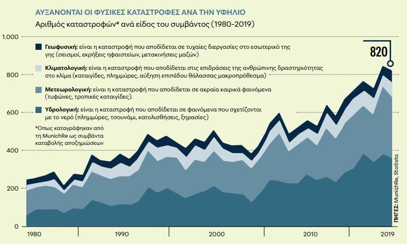 Το ετήσιο κόστος των αποζημιώσεων που σχετίζονται με φυσικές καταστροφές στις ΗΠΑ έχει εκτιναχθεί κατά 1.580% υψηλότερα τις τελευταίες τέσσερις δεκαετίες. Πρόκειται για μια περίοδο βέβαια που, όπως φαίνεται και στο γράφημα, έχουν αυξηθεί θεαματικά οι «υδρολογικές, μετεωρολογικές και κλιματικές καταστροφές», βάσει της αναλυτικής πλην ταυτολογικής διάκρισης των ειδικών της αντασφαλιστικής MunichRe. Σε αντίθεση με τις φυσικές καταστροφές που δεν οφείλονται στην κλιματική αλλαγή, όπως οι σεισμοί ή οι εκρήξεις ηφαιστείων, οι οποίες παραμένουν σταθερές σε συχνότητα.