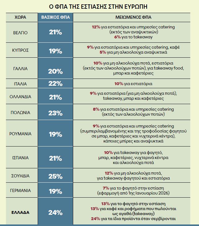 Παράγοντες της εστίασης επικαλούνται και την ανταγωνιστικότητα του ελληνικού τουριστικού πακέτου έναντι άλλων προορισμών της Μεσογείου. Ενδεικτικά αναφέρουν πως στην Κύπρο ο αντίστοιχος ΦΠΑ είναι στο 9%, στην Ιταλία στο 10%, στη Γαλλία στο 10% (εξαιρούνται τα αλκοολούχα ποτά) και στην Ισπανία στο 10% (για φαγητό σε πακέτο και σε καφετέριες και μπαρ).