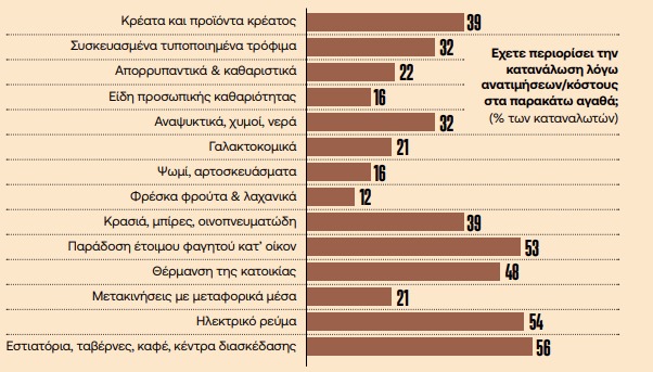 Είναι ενδεικτικό ότι πέραν του φαγητού έξω και του φαγητού απ’ έξω (delivery) που πλέον αποτελεί πολυτέλεια για τους μισούς καταναλωτές και έχει βγει από την καθημερινότητά τους, οι 4 στους 10 έχουν περιορίσει την κατανάλωση κρέατος και προϊόντων κρέατος, καθώς και τα κρασιά, τις μπίρες και τα οινοπνευματώδη λόγω των ανατιμήσεων. Το ίδιο συμβαίνει για 3 στους 10 όσον αφορά την κατανάλωση συσκευασμένων τυποποιημένων τροφίμων, αλλά και αναψυκτικών και χυμών.