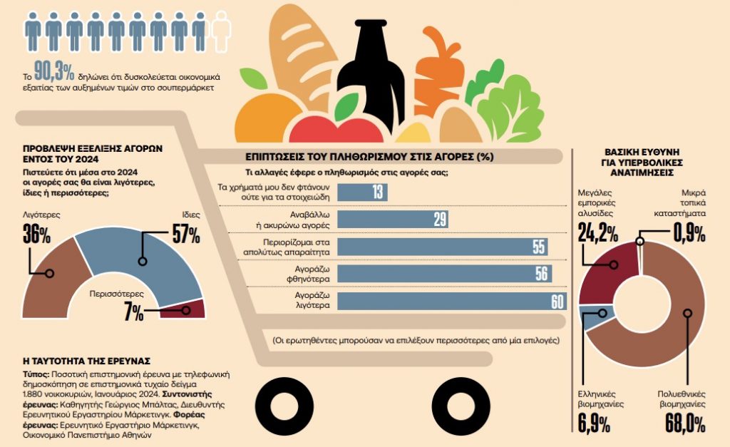 «Τα ευρήματα αυτά είναι εύλογα καθώς η ακρίβεια επηρεάζει πολύ την αξιολόγηση του 2023 και τις προβλέψεις του 2024» επισημαίνει ο συντονιστής της έρευνας και διευθυντής του Ερευνητικού Εργαστηρίου Μάρκετινγκ Γεώργιος Μπάλτας, καθηγητής στο ΟΠΑ.