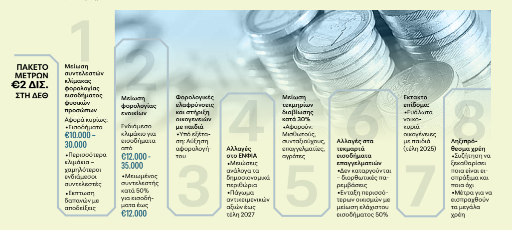 Πακέτο μέτρων δύο δισεκατομμυρίων ευρώ αναμένεται να ανακοινώσει ο πρωθυπουργός κ. Κυριάκος Μητσοτάκης στις αρχές Σεπτεμβρίου από το βήμα της 89ης Διεθνούς Εκθεσης Θεσσαλονίκης, το οποίο θα αφορά φορολογικές ελαφρύνσεις, επιδόματα και ενισχύσεις για μισθωτούς, συνταξιούχους, αγρότες, ελεύθερους επαγγελματίες και εισοδηματίες.
