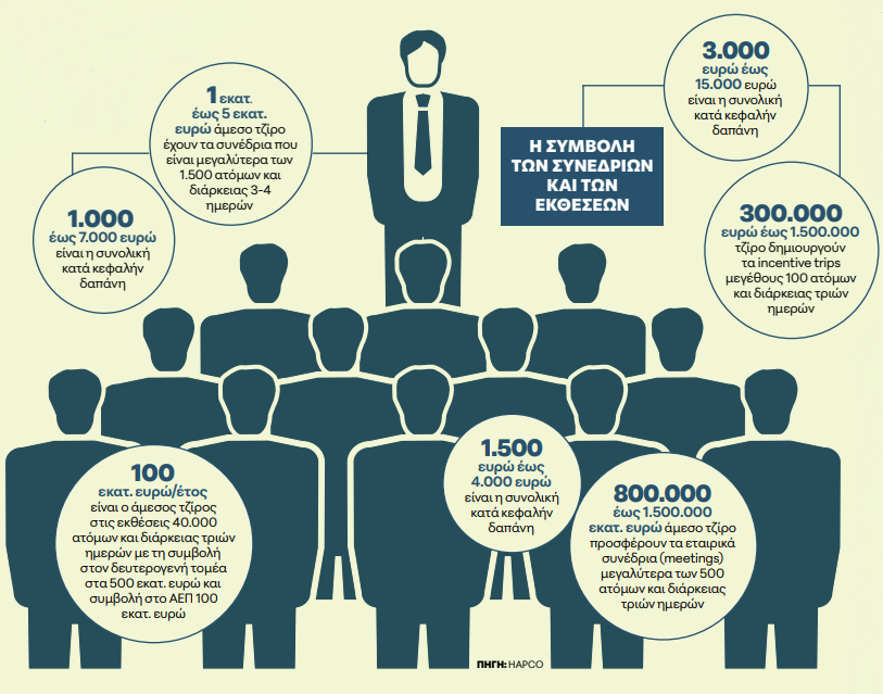Ειδικότερα, σύμφωνα με μελέτη του Συνδέσμου Ελλήνων Επαγγελματιών Εκδηλώσεων και Οργανωτών Συνεδρίων (HAPCO & DES), ο κλάδος του συνεδριακού τουρισμού και των events στην Ελλάδα συμβάλλει σήμερα κατ’ εκτίμηση με περισσότερο από 2,5 δισ. ευρώ στην εθνική οικονομία, ποσό που μπορεί μεσοπρόθεσμα και υπό προϋποθέσεις να φτάσει στα 6,5 δισ. ευρώ.