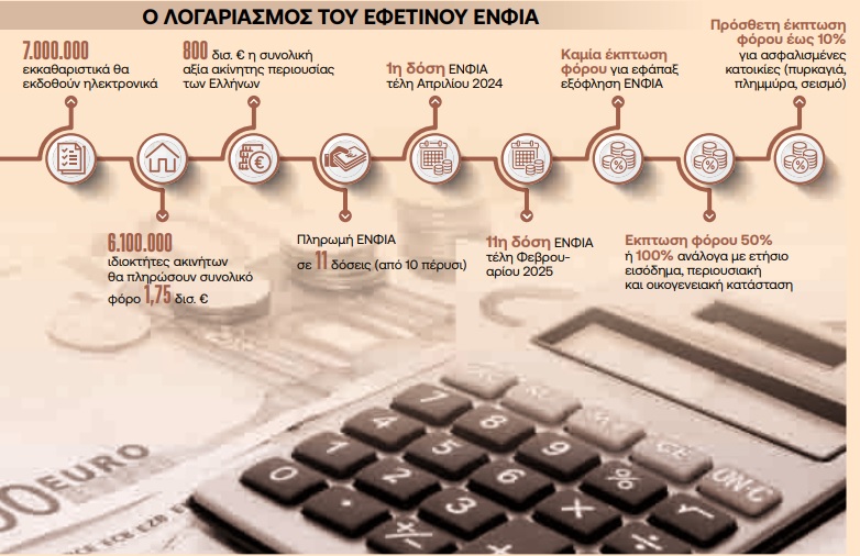 Από το σύνολο 7.100.000 ιδιοκτητών ακινήτων στην Ελλάδα, ΕΝΦΙΑ θα κληθούν να πληρώσουν περίπου 6.100.000 ιδιοκτήτες ακινήτων – φυσικά πρόσωπα – και το συνολικό ποσό ανέρχεται σε 1,75 δισ. ευρώ. Το ποσό και ο αριθμός των πολιτών που καλούνται να πληρώσουν ΕΝΦΙΑ θα ήταν πολύ υψηλότερος αν δεν είχαν θεσμοθετηθεί εκπτώσεις και αφορολόγητα ποσά. Με βάση τα ισχύοντα, παρέχεται γενναία έκπτωση 50% ή και 100% ανάλογα με το ετήσιο εισόδημα, την περιουσιακή και την οικογενειακή κατάσταση των ιδιοκτητών. Εφέτος για πρώτη φορά περίπου 350.000 ιδιοκτήτες ακινήτων, σε σύνολο περίπου 900.000 που έχουν ασφαλισμένα τα ακίνητά τους, θα έχουν έκπτωση στον ΕΝΦΙΑ έως 10%. Οι υπόλοιποι 550.000 δεν θα έχουν καμία έκπτωση γιατί, όπως προκύπτει από τα στοιχεία που έχει αντλήσει το υπουργείο Οικονομικών, δεν έχουν ασφαλίσει την κατοικία τους και για τους τρεις κινδύνους φυσικών καταστροφών που προβλέπει ο νέος νόμος, δηλαδή από πυρκαγιά, σεισμό και πλημμύρα. Στο υπουργείο Οικονομικών, τελικά, δεν έλαβαν υπ’ όψιν τα πολλά αιτήματα που δέχθηκαν ειδικά για εφέτος να υπάρχει μια εξαίρεση και η έκπτωση του 10% να αφορά και εκείνους που έχουν ασφαλίσει την κατοικία τους για δύο από τους τρεις κινδύνους.