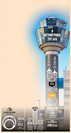 Η ανθεκτικότητα που επέδειξε ο Διεθνής Αερολιμένας Αθηνών αποτυπώθηκε στις οικονομικές επιδόσεις του 2021. Τα λειτουργικά έσοδα ανήλθαν το 2021 στα 272,2 εκατ. ευρώ, μειωμένα κατά́ 46% έναντι του 2019, αλλά βελτιωμένα σε σύγκριση με το 2020 κατά 86 εκατ. ευρώ.