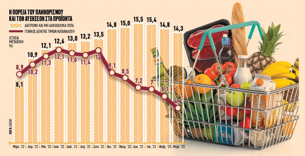 Αυτή τη στιγμή ο πληθωρισμός στην ομάδα «Διατροφή και μη αλκοολούχα ποτά» ενώ επιβραδύνεται για τρεις μήνες στη σειρά έχει υποχωρήσει μόλις 1,2% από τα υψηλά του περασμένου Δεκέμβρη και είναι τριπλάσιος συγκριτικά με τον μέσο πληθωρισμό.